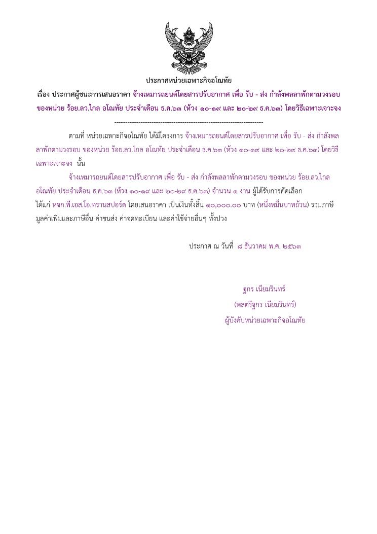 ประกาศผู้ชนะการเสนอราคา จ้างเหมารถยนต์โดยสารปรับอากาศ เพื่อ รับ – ส่ง กำลังพลลาพักตามวงรอบของหน่วย ร้อย.ลว.ไกล อโณทัย ประจำเดือน ธ.ค.63 (ห้วง 10 – 19 และ 20 – 29 ธ.ค.63) โดยวิธีเฉพาะเจาะจง (10,000.00)