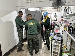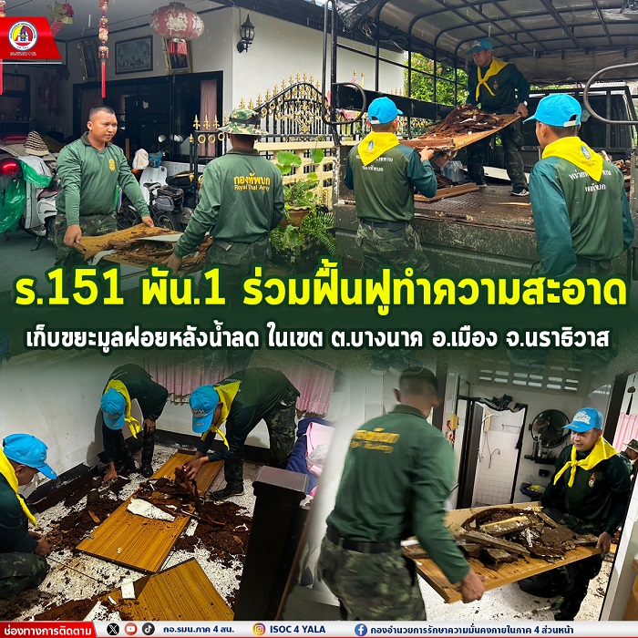 วันที่ 12 ธันวาคม 2567 เวลา 13.00 น. ศูนย์บรรเทาสาธารณภัย มณฑลทหารบกที่ 46 โดย กองพันทหารราบที่ 1 กรมทหารราบที่ 151 ระดมกำลังพล พร้อมวัสดุอุปกรณ์ เครื่องจักรกล ร่วมกับผู้นำชุมชน เข้าช่วยเหลือประชาชนทำความสะอาดบ้าน หลังน้ำลด บริเวณซอยประชาภิรมย์ ตำบลบางนาค อำเภอเมือง จังหวัดนราธิวาส ที่ได้รับผลกระทบจากสถานการอุทกภัย ฝนตกหนักครั้งที่ 2 เพื่อเร่งฟื้นฟูพื้นที่ให้สะอาด พี่น้องประชาชนได้กลับไปใช้ชีวิตอย่างปกติสุขโดยเร็วที่สุด