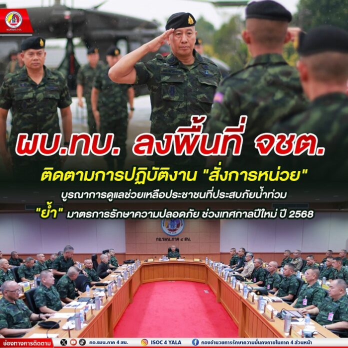 วันนี้ (13 ธันวาคม 2567) เวลา 10.50 น. ณ ห้องประชุม 1 กองอำนวยการรักษาความมั่นคงภายในภาค 4 ส่วนหน้า ค่ายสิรินธร ตำบลเขาตูม อำเภอยะรัง จังหวัดปัตตานี พลเอก พนา แคล้วปลอดทุกข์ ผู้บัญชาการทหารบก / รองผู้อำนวยการรักษาความมั่นคงภายในราชอาณาจักร พร้อมด้วยคณะผู้บังคับบัญชาระดับสูงจากกองทัพบก ลงพื้นที่ติดตามสถานการณ์พื้นที่จังหวัดชายแดนภาคใต้ โดยเยี่ยมให้กำลังใจ ตลอดจนประชุมรับฟังบรรยายสรุปการปฏิบัติงานของหน่วย พร้อมร่วมหารือ รับฟังปัญหาข้อขัดข้อง และข้อเสนอแนะในการขับเคลื่อนการแก้ไขปัญหาจังหวัดชายแดนภาคใต้ให้มีประสิทธิภาพครอบคลุมทุกมิติ โดยเฉพาะมาตราการช่วยเหลือประชาชนที่ประสบอุทกภัยในพื้นที่ รวมถึงแผนมาตราการรักษาความปลอดภัยในชีวิตและทรัพย์สินของประชาชนห้วงเทศกาลปีใหม่ 2568 เพื่อสร้างความสุข สร้างความมั่นใจ ความปลอดภัยแก่พี่น้องประชาชนในห้วงเทศกาลดังกล่าว โดยมี พลโท ไพศาล หนูสังข์ แม่ทัพภาคที่ 4 / ผู้อำนวยการรักษาความมั่นคงภายในภาค 4 พร้อมด้วย รองเลขาธิการศูนย์อำนวยการบริหารจังหวัดชายแดนภาคใต้ ผู้บังคับบัญชา และฝ่ายอำนวยการของกองอำนวยการรักษาความมั่นคงภายในภาค 4 ส่วนหน้า ให้การต้อนรับ และร่วมประชุมฯ
