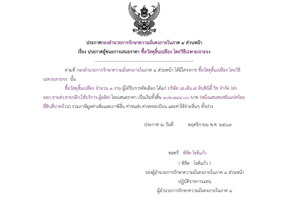 ประกาศผู้ชนะการเสนอราคา ซื้อวัสดุสิ้นเปลือง โดยวิธีเฉพาะเจาะจง