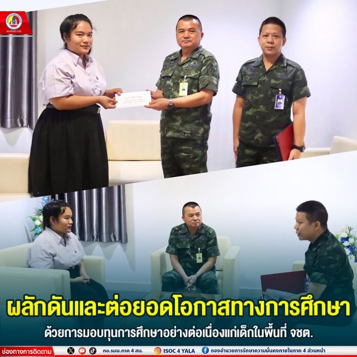 การศึกษาเป็นปัจจัยพื้นฐานที่สำคัญในการพัฒนาคุณภาพชีวิตของคนในสังคม อีกทั้งยังเป็นกุญแจสำคัญในการสร้างความเจริญก้าวหน้าให้กับประเทศชาติ อย่างไรก็ตาม ยังมีเด็กและเยาวชนจำนวนไม่น้อยที่ขาดโอกาสทางการศึกษาเนื่องจากปัญหาทางเศรษฐกิจและสภาพแวดล้อมที่ไม่เอื้ออำนวย ทุนการศึกษาจึงเป็นกลไกสำคัญในการช่วยเหลือเยาวชนเหล่านี้ ให้มีโอกาสในการเรียนรู้ พัฒนาตนเอง และก้าวสู่อนาคตที่ดีขึ้นได้ โอกาสนี้ทางมูลนิธิจิตติน ตันธุวนิตย์ ได้มอบทุนการศึกษาต่อเนื่องในปี 2567 จำนวน 61 ทุน เป็นเงิน 354,000 บาท รวมถึงในส่วนของ กองอำนวยการรักษาความมั่นคงภายในภาค 4 ส่วนหน้า มีนักศึกษาที่ได้รับทุนการศึกษาต่อเนื่องจำนวน 1 ทุน คือ นางสาว กรรณิการ์ คงทน ซึ่งศึกษาอยู่ในระดับอุดมศึกษาปีที่ 4 มหาวิทยาลัยราชภัฎยะลา อำเภอเมือง จังหวัดยะลา เป็นเงิน 18,000 บาท เพื่อเป็นการส่งเสริมและสนับสนุนการศึกษาให้กับเด็กในพื้นที่จังหวัดชายแดนภาคใต้อย่างต่อเนื่อง จนจบการศึกษาระดับปริญญาตรี โดยมี พันเอก อนุชา โนนคู่เขตโขง รองเลขาธิการกองอำนวยการรักษาความมั่นคงภายในภาค 4 ส่วนหน้า เป็นประธานในพิธีมอบทุนการศึกษาให้กับนักเรียน นักศึกษา ในวันนี้ (17 ธันวาคม 2567) เวลา 09.45 น. ห้องรับรองรวงผึ้ง กองอำนวยการรักษาความมั่นคงภายในภาค 4 ส่วนหน้า ค่ายสิรินธร ตำบลเขาตูม อำเภอยะรัง จังหวัดปัตตานี