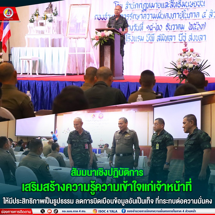 วันนี้ (18 ธันวาคม 2567) เวลา 10.00 น. พลตรี กรกฎ ภู่โชติ รองผู้อำนวยการรักษาความมั่นคงภายในภาค 4 ส่วนหน้า เป็นประธานในพิธีเปิด สัมมนาเชิงปฏิบัติการเพื่อเสริมสร้างความรู้ความเข้าใจให้กับเจ้าหน้าที่ เพื่อบังคับใช้กฎหมายอันเกิดจากการบิดเบือนข้อมูลข่าวสารที่มีผลกระทบต่อความมั่นคง ประจำปีงบประมาณ 2568 โดยมี ข้าราชการฝ่ายปกครองและเจ้าหน้าที่ตำรวจที่ปฏิบัติงานในพื้นที่จังหวัดชายแดนภาคใต้และ 4 อำเภอ ของจังหวัดสงขลา ณ โรงแรมบีพี สมิหลา บีช รีสอร์ท อำเภอเมืองสงขลา จังหวัดสงขลา ระหว่างวันที่ 18 – 20 ธันวาคม 2567