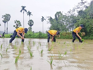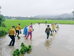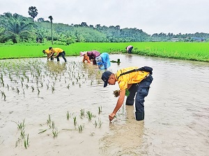 บรรยากาศการดำนาปลูกข้าว ณ บ้านนาหว้า หมู่ที่ 3 ตำบลทุ่งคล้า อำเภอสายบุรี จังหวัดปัตตานี ในครั้งนี้ ทุกคนต่างร่วมแรงร่วมใจกันลงแขกดำนาปลูกข้าวอย่างขะมักเขม้น โดยมี หน่วยเฉพาะกิจกรมทหารพรานที่ 44 จัดกำลังพลชุดปฏิบัติการกิจการพลเรือน (ชป.กร.) ร่วมกับ ส่วนราชการ และพี่น้องประชาชนในพื้นที่ ร่วมกิจกรรม “ดำนาเพาะปลูกข้าว” ตามแนวทางวิถีชีวิตพอเพียง โดยยึดหลักปรัชญาเศรษฐกิจพอเพียงจากแนวพระราชดำริในหลวงรัชกาลที่ 9 ซึ่งทุกคนได้ช่วยกันปลูกต้นกล้าด้วยความรู้สึกสนุกสนานทุกคนล้วนมาด้วยความเต็มใจและดีใจที่ได้มีส่วนร่วมในการอนุรักษ์สืบสานประเพณีอันดีงามของไทยวัฒนธรรมของการทำอาชีพเกษตรกรรมดั้งเดิมไม่ให้สูญหายไปจากพื้นที่