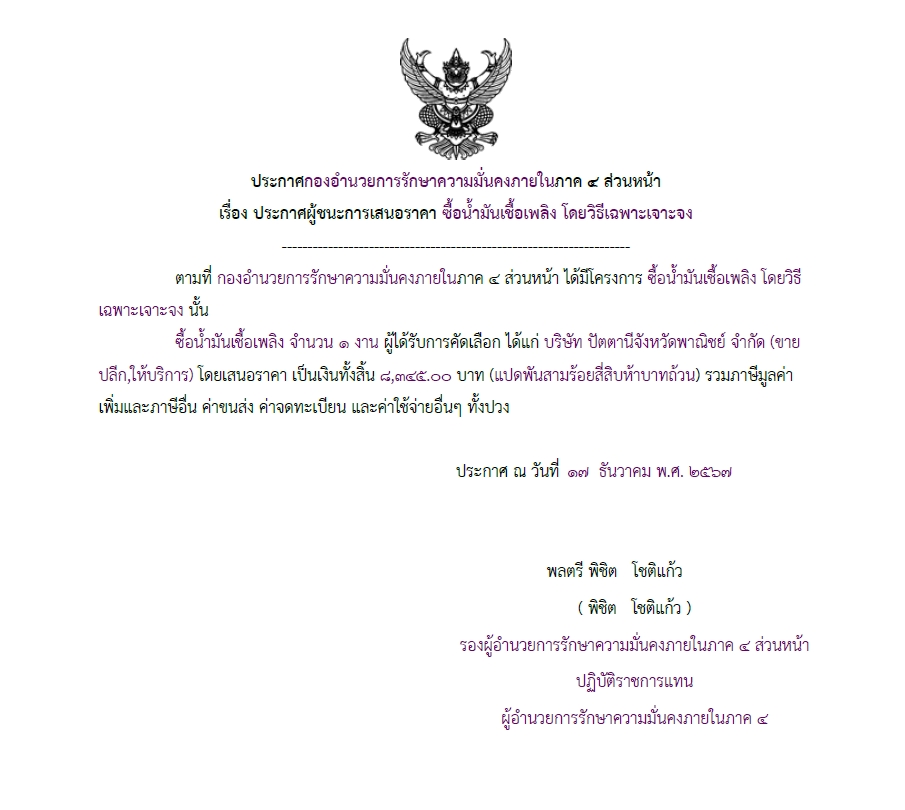 ประกาศผู้ชนะการเสนอราคา ขึ้นน้ำมันเชื้อเพลิง โดยวิธีเฉพาะเจาะจง