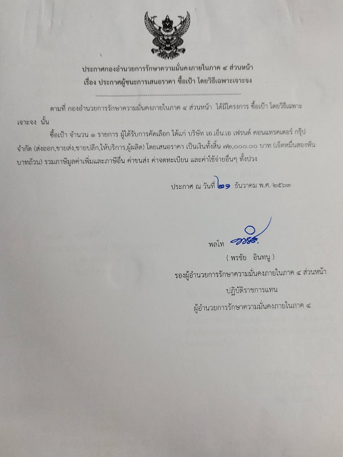 ประกาศผู้ชนะการเสนอราคา ซื้อเป้า โดยวิธีเฉพาะเจาะจง (72,000.00)