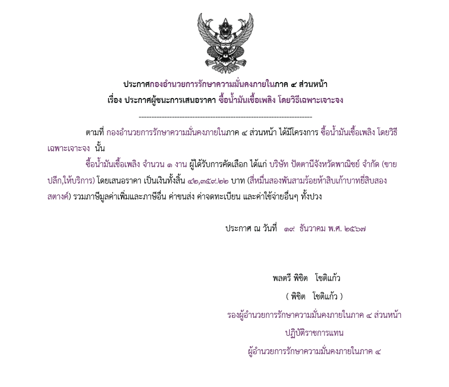ประกาศผู้ชนะการเสนอราคา ซื้อน้ำมันเชื้อเพลิง โดยวิธีเฉพาะเจาะจง
