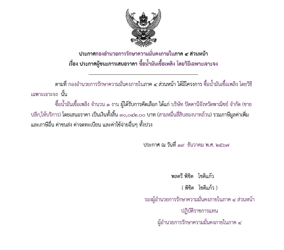ประกาศผู้ชนะการเสนอราคา ซื้อน้ำมันเชื้อเพลิง โดยวิธีเฉพาะเจาะจง