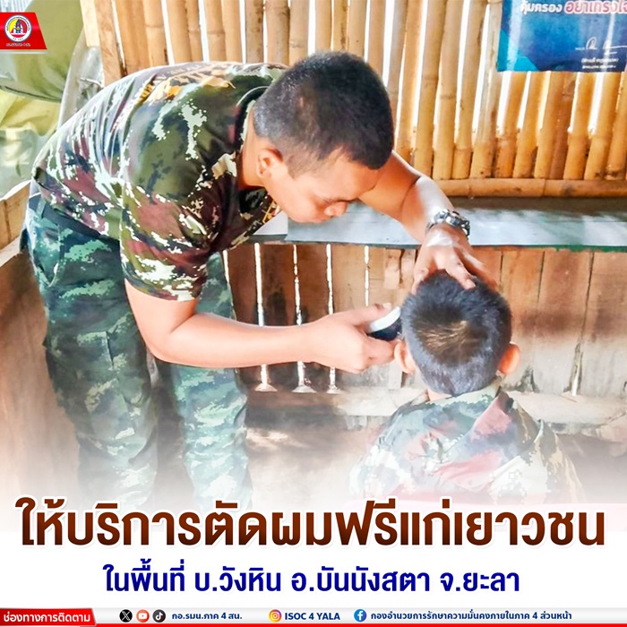 เมื่อวันที่ 21 ธันวาคม 2567 ที่ ฐานปฏิบัติการของหน่วยในพื้นที่ บ้านวังหิน ตำบลบันนังสตา อำเภอบันนังสตา จังหวัดยะลา หน่วยเฉพาะกิจ กองพันทหารราบที่ 1 (ฉก.พัน.ร.ที่ 1) จัดกำลังพล ให้การบริการตัดผมแก่เยาวชนในพื้นที่ ตามโครงการ “เกศาสานใจ เพื่อพี่น้องประชาชน และเยาวชนในพื้นที่ เพื่อเป็นการช่วยเหลือแบ่งเบาภาระค่าใช้จ่ายในการตัดผมของบุตรหลาน ให้กับราษฎรในพื้นที่ และเป็นการสร้างความเชื่อมั่นให้กับพี่น้องประชาชนในพื้นที่ ภายใต้สังคมการอยู่ร่วมกันของพี่น้องประชาชนกับเจ้าหน้าที่ทางภาครัฐอย่างสันติสุขโดย