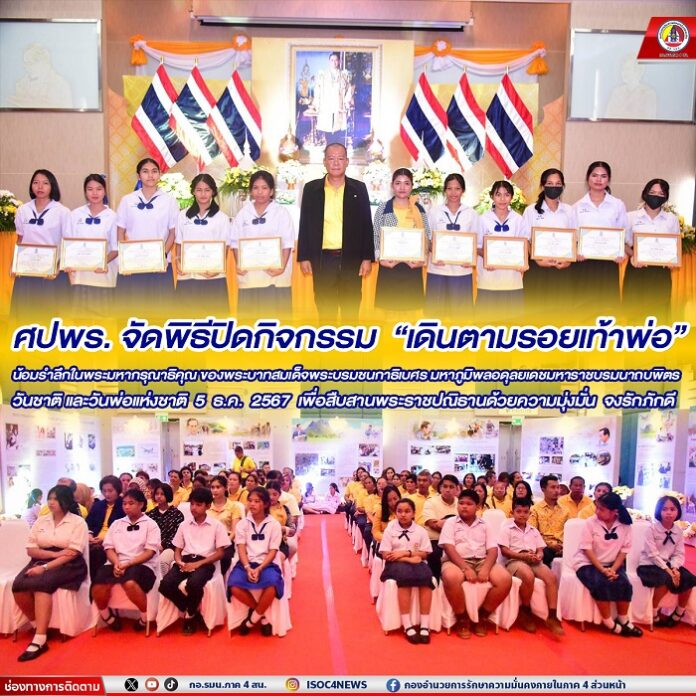 โดยศูนย์ประสานงานโครงการอันเนื่องมาจากพระราชดำริ จัดกิจกรรม “เดินตามรอยเท้าพ่อ” ประจำปี 2567 เพื่อน้อมรำลึกในพระมหากรุณาธิคุณ ของพระบาทสมเด็จพระบรมชนกาธิเบศร มหาภูมิพลอดุลยเดชมหาราชบรมนาถบพิตร เนื่องในวันคล้ายวันพระบรมราชสมภพ 5 ธันวาคม 2567 ที่ทรงปฏิบัติพระราชกรณียกิจ เพื่อประโยชน์สุขของปวงชนชาวไทย มุ่งเน้นให้ประชาชนได้มีความรู้ความเข้าใจข้อมูลสถาบันหลักของชาติที่ถูกต้อง ได้รับทราบถึงพระราชกรณียกิจของพระองค์ท่าน ผ่านโครงการอันเนื่องมาจากพระราชดำริต่าง ๆ ทั้งนี้การจัดกิจกรรมได้เสร็จสิ้นเป็นที่เรียบร้อย ในห้วงการจัดกิจกรรมมีผู้ให้ความสนใจและเข้าร่วมกิจกรรมเป็นจำนวนมาก น้องๆเยาวชนต่างตอบรับและบอกว่าหากมีการจัดกิจกรรมในครั้งหน้าก็จะมาเข้าร่วมอีกอย่างแน่นอน อีกทั้งประชาชนที่มาร่วมกิจกรรมได้กล่าวถึงในหลวงรัชกาลที่ 9 ว่า คิดถึงในหลวงรัชกาลที่ 9 และพระองค์สถิตย์อยู่ในใจคนไทยตราบนิรันดร์