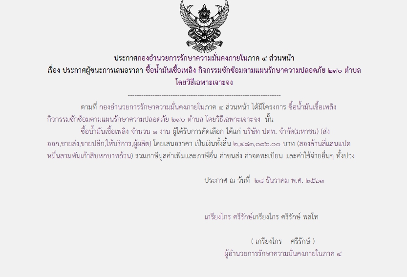 จัดซื้อ จัดจ้างประกาศผู้ชนะการเสนอราคา ประกาศผู้ชนะการเสนอราคา ซื้อน้ำมันเชื้อเพลิง กิจกรรมซักซ้อมตามแผนรักษาความปลอดภัย 290 ตำบล โดยวิธีเฉพาะเจาะจง (2,483,096.00) December 28, 2020 856 Share Facebook Twitter Google+ Telegram LINE สกบ.กอ.รมน.ภาค 4 สน.