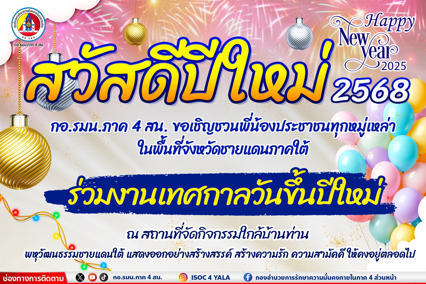 เริ่มต้นที่จังหวัดแรก พาไปเคาท์ดาวน์ ส่งท้ายปีเก่าต้อนรับปีใหม่ที่อำเภอเบตง จังหวัดยะลา กับงาน BETONG COUNTDOWN 2025 จัดขึ้นที่ บริเวณสวนสาธารณะเทศบาลเมืองเบตง และพื้นที่บริเวณใกล้เคียง ในวันที่ 31 ธันวาคม 2567 ตั้งแต่เวลา 20.00 น. เป็นต้นไป ภายในงานมีการแสดงจากเยาวชน การแสดงดนตรีจาก The Cat, การแสดงของดีเจ X Tension และ Violet Queen, การแสดงดนตรีจากฟลุ๊ค ไอน้ำ ปิดท้ายด้วยการร่วมนับถอยหลังสู่ศักราชใหม่ และชมการแสดงพลุ นอกจากนี้ยังมีเทศกาลงานดอกไม้บาน และแสง สี เสียง เสน่ห์เมืองเบตง (Flower Festival at Betong) ชมแสง สีเสียง เสน่ห์เมืองเบตง ยามค่ำคืน ณ บริเวณปฏิมากรรมรูปปั้นมือ และสวนสาธารณะเทศบาลเมืองเบตง ตลอดจนพื้นที่ใกล้เคียง (บนเขา) ซึ่งจัดตั้งแต่วันที่ 25 ธันวาคม 2567 – 3 มกราคม 2568