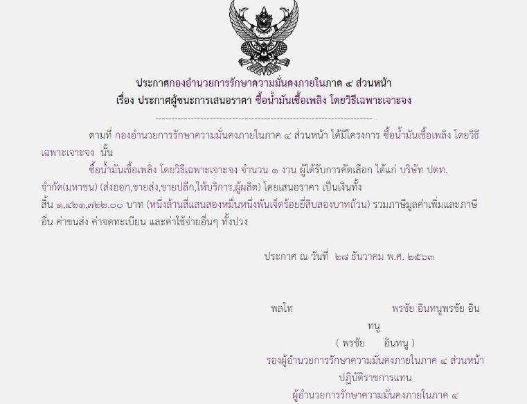ประกาศผู้ชนะการเสนอราคา ซื้อน้ำมันเชื้อเพลิง โดยวิธีเฉพาะเจาะจง (1,421,722.00)
