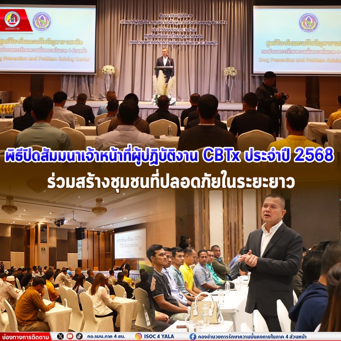 ศูนย์ป้องกันและแก้ไขปัญหายาเสพติด กองอำนวยการรักษาความมั่นคงภายในภาค 4 ส่วนหน้า จัดประชุมสัมมนาเชิงปฏิบัติการเจ้าหน้าที่ผู้ปฏิบัติงานศูนย์บำบัดฟื้นฟูการมีส่วนร่วมของชุมชน CBTx ประจำปีงบประมาณ 2568 ระหว่างวันที่ 23 ธันวาคม – 25 ธันวาคม 2567 ที่โรงแรมลากูน่า แกรนด์ โฮเทล แอนด์ สปา ตำบลพะวง อำเภอเมือง จังหวัดสงขลา เพื่อพัฒนาความรู้ ความสามารถ และเสริมสร้างทักษะของเจ้าหน้าที่ที่ปฏิบัติงานในศูนย์บำบัดฟื้นฟูการมีส่วนร่วมของชุมชน (CBTx) ให้สามารถดำเนินงานได้อย่างมีประสิทธิภาพและตอบสนองความต้องการของชุมชน ทั้งนี้ วันที่ 25 ธันวาคม 2567 เวลา 11.00 น. พลตรี วรเดช เดชรักษา รองแม่ทัพภาคที่ 4/รองผู้อำนวยการรักษาความมั่นคงภายในภาค 4 ส่วนหน้า เป็นประธานพิธีปิดกิจกรรม โดยมี เจ้าหน้าที่ผู้ปฏิบัติงานศูนย์บำบัดฟื้นฟูการมีส่วนร่วมของชุมชน CBTx จากจังหวัดสงขลา ยะลา ปัตตานี และนราธิวาส เข้าร่วม