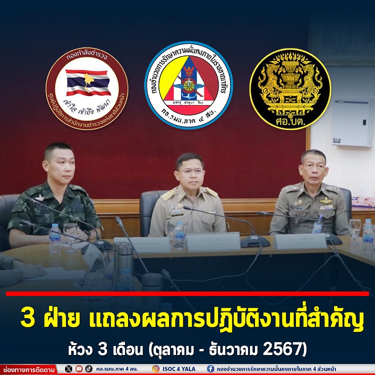 วันที่ 26 ธันวาคม 2567 กองอำนวยการรักษาความมั่นคงภายในภาค 4 ส่วนหน้า พร้อมด้วย กองกำลังตำรวจจังหวัดชายแดนภาคใต้ และศูนย์อำนวยการบริหารจังหวัดชายแดนภาคใต้ ร่วมแถลงผลการปฏิบัติงานของหน่วย เพื่อประชาสัมพันธ์สร้างความเข้าใจแก่พี่น้องประชาชน ต่อการปฏิบัติงานของหน่วยในพื้นที่จังหวัดชายแดนภาคใต้ เพื่อบูรณาการทำงานร่วมแก้ไขปัญหาและพัฒนาสร้างสันติสุขให้เกิดขึ้นในพื้นที่จังหวัดชายแดนภาคใต้ โดยมี พันเอก ปองพล สุทธิเบญจกุล รองโฆษกกองอำนวยการรักษาความมั่นคงภายในภาค 4 ส่วนหน้า พร้อมด้วย พันตำรวจเอก อนุพงษ์ ทัศนา หัวหน้างานกฎหมายและสอบสวนกองกำลังตำรวจจังหวัดชายแดนภาคใต้ และนายธีรวิทย์ เฑียรฆโรจน์ รองโฆษกศูนย์อำนวยการบริหารจังหวัดชายแดนภาคใต้ ร่วมแถลงผลการปฏิบัติงานที่สำคัญ ในห้วงเดือนตุลาคม ถึง เดือนธันวาคม 2567