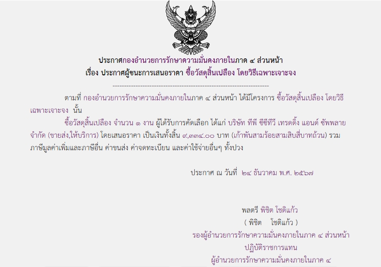 ประกาศผู้ชนะการเสนอราคา ซื้อวัสดุสิ้นเปลือง โดยวิธีเฉพาะเจาะจง