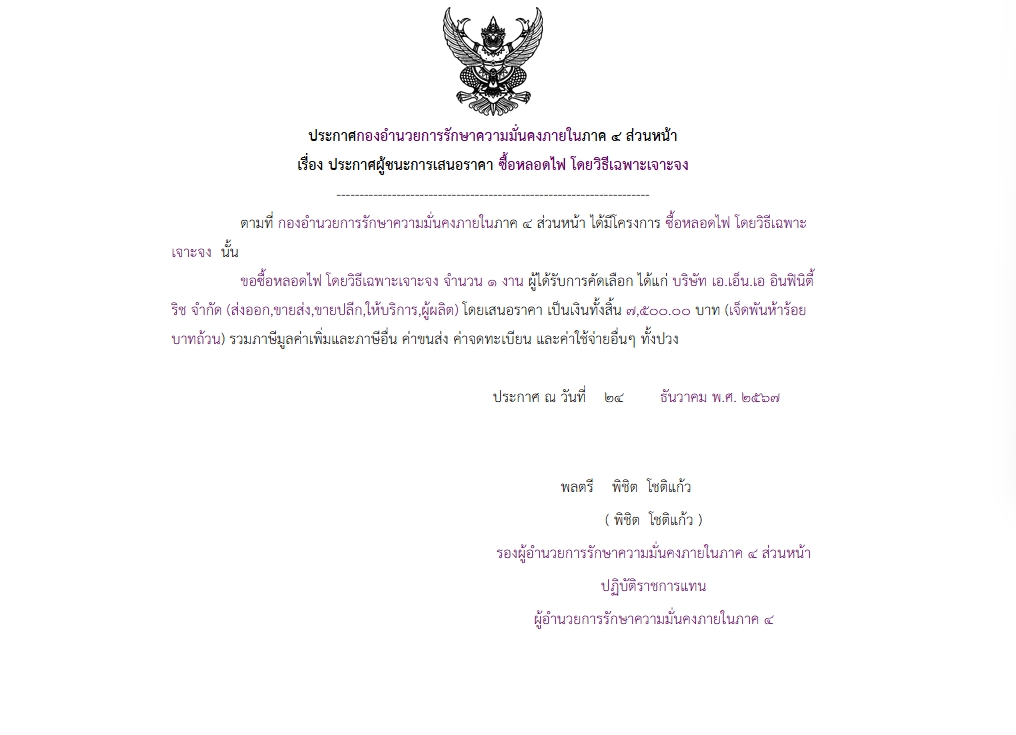 ประกาศผู้ชนะการเสนอราคา ซื้อหลอดไฟ โดยวิธีเฉพาะเจาะจง
