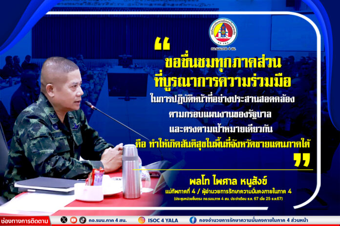 ประชาสัมพันธ์ข่าวประชาสัมพันธ์ ขอชื่นชมทุกภาคส่วนที่บูรณาการความร่วมมือ ในการปฏิบัติหน้าที่อย่างประสานสอดคล้องตามกรอบแผนงานของรัฐบาล และตรงตามเป้าหมายเดียวกัน คือ ทำให้เกิดสันติสุขในพื้นที่จังหวัดชายแดนภาคใต้ December 27, 2024 280 Share Facebook Twitter Google+ Telegram LINE พลโท ไพศาล หนูสังข์ แม่ทัพภาคที่ 4 / ผู้อำนวยการรักษาความมั่นคงภายในภาค 4 (ประชุมหน่วยขึ้นตรง กอ.รมน.ภาค 4 สน. ประจำเดือน ธ.ค. 67 เมื่อ 25 ธ.ค.67) แม่ทัพภาคที่4 แม่ทัพไพศาล ศูนย์ประชาสัมพันธ์กองอำนวยการรักษาความมั่นคงภายในภาค4ส่วนหน้า