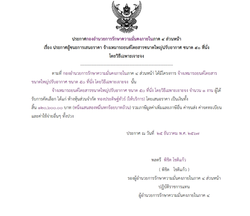 ประกาศผู้ชนะการเสนอราคา จ้างเหมารถยนต์โดยสารขนาดใหญ่ปรับอากาศ ขนาด ๕๐ ที่นั่ง โดยวิธีเฉพาะเจาะจง