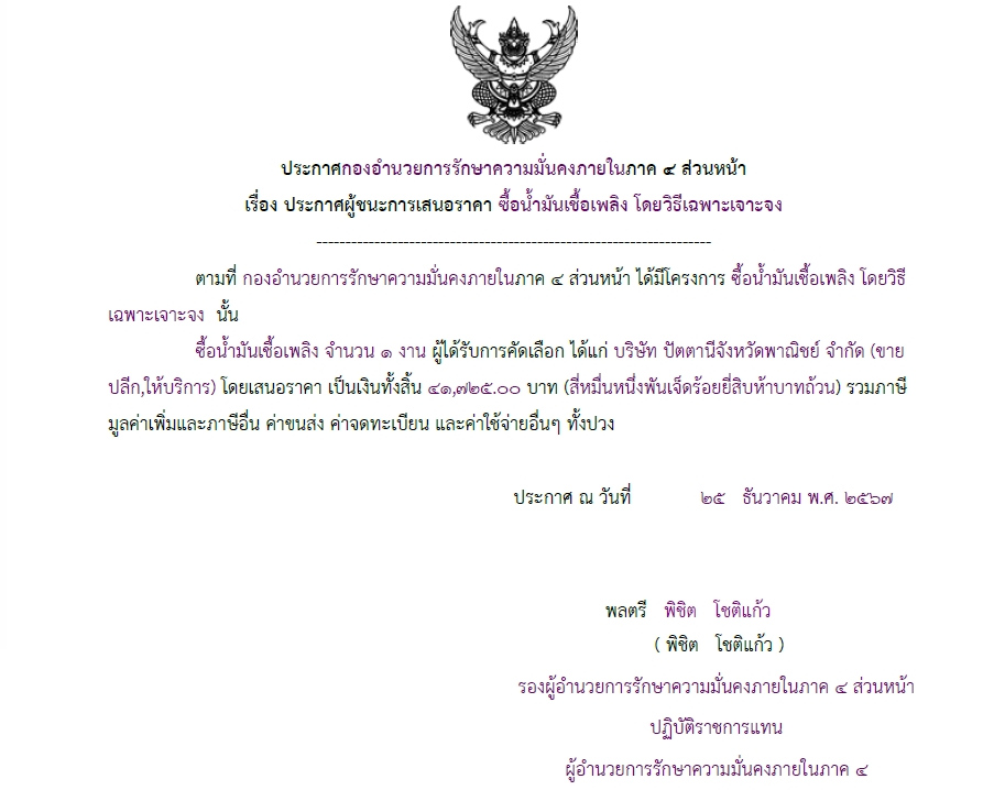 ประกาศผู้ชนะการเสนอราคา ซื้อน้ำมันเชื้อเพลิง โดยวิธีเฉพาะเจาะจง