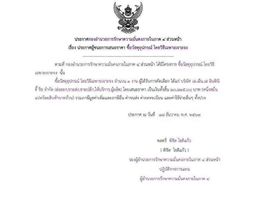 ประกาศผู้ชนะการเสนอราคา ซื้อวัสดุอุปกรณ์ โดยวิธีเลพาะเจาะจง
