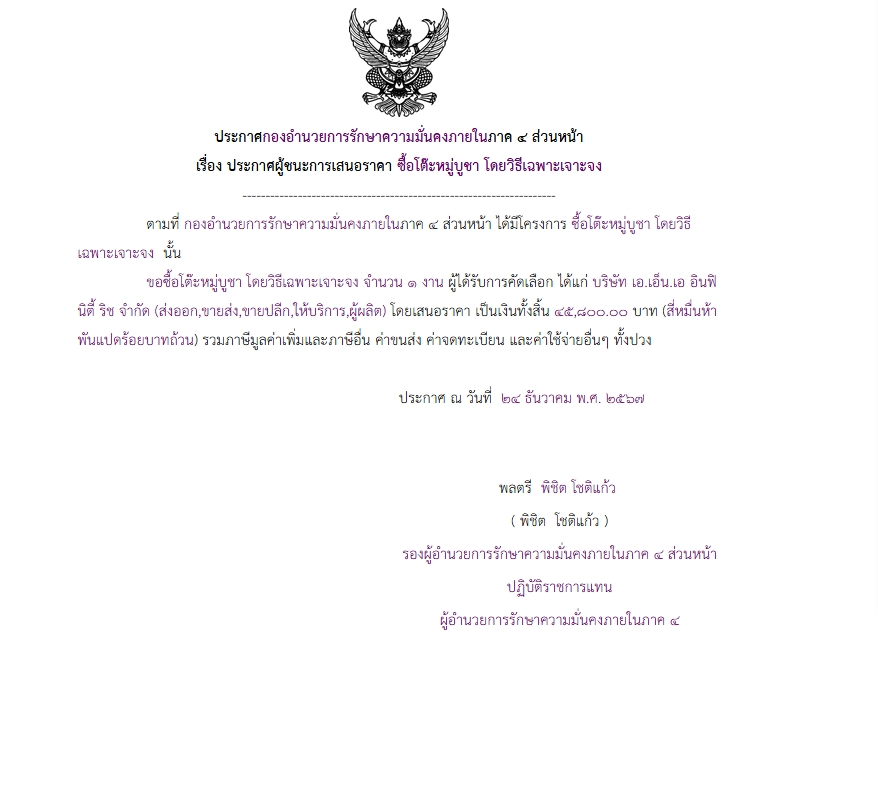 ประกาศผู้ชนะการเสนอราคา ซื้อโต๊ะหมู่บูชา โดยวิธีเฉพาะเจาะจง
