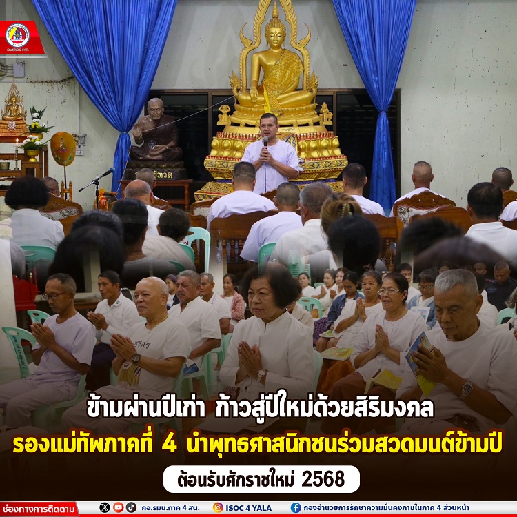 ในวันที่ (31 ธันวาคม 2567) เวลา 23.30 น. ที่ วัดรัตนานุภาพ (บ้านโคกโก) อำเภอสุไหงปาดี จังหวัดนราธิวาส พลตรี วรเดช เดชรักษา รองแม่ทัพภาคที่ 4 / ผู้อำนวยการรักษาความมั่นคงภายในภาค 4 ส่วนหน้า เป็นประธานในพิธีสวดมนต์ข้ามปี ส่งท้ายปีเก่าต้อนรับปีใหม่ ปี 2568 เพื่ออุทิศถวายพระราชกุศลแด่สมเด็จพระบูรพมหากษัตริยาธิราช และถวายพระราชกุศลแด่พระบาทสมเด็จพระเจ้าอยู่หัวและพระบรมวงศานุวงศ์ โดยมี พลตรี เฉลิมพร ขำเขียว ผู้บัญชาการกองพลทหารราบที่ 15 / ผู้บังคับหน่วยเฉพาะกิจนราธิวาส, คณะผู้บังคับบัญชา, ทหาร, ตำรวจ, ส่วนราชการ, ตลอดจนพี่น้องประชาชนในพื้นที่ เข้าร่วมในพิธีรักษาศีลเจริญจิตภาวนา ร่วมปฏิบัติธรรมและสวดมนต์ข้ามปี เพื่อเสริมสร้างสิริมงคลแก่ตนเองและครอบครัว