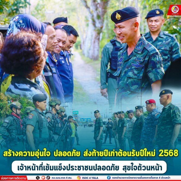 พลตรีกรกฏ ภู่โชติ รองผู้อำนวยการรักษาความมั่นคงภายในภาค 4 ส่วนหน้า พร้อมด้วยคณะผู้บังคับบัญชา กองอำนวยการรักษาความมั่นคงภายในภาค 4 ส่วนหน้า เดินสายลงพื้นที่ตรวจเยี่ยม เพื่อบำรุงขวัญ และให้กำลังใจแก่กำลังพล ชุดปฏิบัติงานตามจุดตรวจ ด่านตรวจ จุดบริการประชาชน ฐานปฏิบัติการชุดคุ้มครองตำบล พร้อมทั้งลงไปพบปะเยี่ยมเยียนพี่น้องประชาชน ทั้งไทยพุทธ และไทยมุสลิมในพื้นที่ เนื่องในเทศกาลส่งท้ายปีเก่าต้อนรับปีใหม่ 2568 ในพื้นที่จังหวัดยะลา ทั้งนี้เพื่อสร้างความมั่นใจ อุ่นใจด้านความปลอดภัยแก่พี่น้องประชาชนในช่วงเทศกาลต้อนรับปีใหม่ รวมถึงลงไปเน้นย้ำนโยบายตามมาตรการรักษาความปลอดภัยพื้นที่แก่เจ้าหน้าที่ให้เฝ้าระวังคุมเข้มสร้างความปลอดภัยแก่ประชาชน ตลอดจนอำนวยความสะดวกแก่พี่น้องประชาชน โดยมีหัวหน้าส่วนราชการ ทหาร ตำรวจ ฝ่ายปกครอง สาธารณสุข ผู้นำท้องที่ ท้องถิ่น ร่วมให้การต้อนรับ ทั้งนี้การปฏิบัติงานทุกฝ่ายให้ความร่วมมือในการปฏิบัติงานเป็นอย่างดี