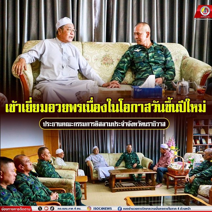 ณ สำนักงานคณะกรรมการอิสลามประจำจังหวัดนราธิวาส อำเภอยี่งอ จังหวัดนราธิวาส พลตรี เฉลิมพร ขำเขียว ผู้บัญชาการกองพลทหารราบที่ 15/ผู้บังคับหน่วยเฉพาะกิจนราธิวาส พร้อมด้วยคณะ เข้าเยี่ยมเเละกล่าวคำอวยพรเนื่องในโอกาสวันขึ้นปีใหม่ 2568 เเด่ นายซาฟีอี เจ๊ะเลาะ ประธานคณะกรรมการอิสลามประจำจังหวัดนราธิวาส เเละคณะฯ
