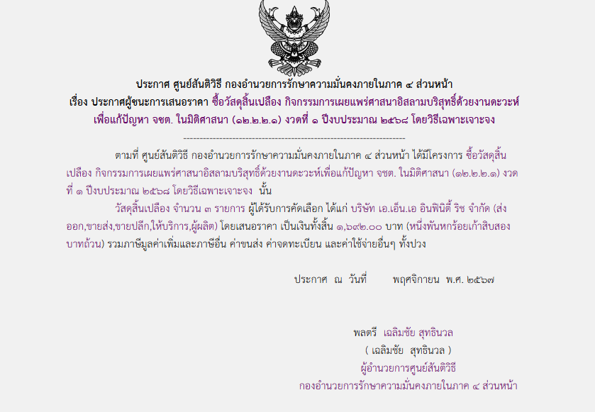 จัดซื้อ จัดจ้างประกาศผู้ชนะการเสนอราคา ประกาศผู้ชนะการเสนอราคา ซื้อวัสดุสิ้นเปลือง กิจกรรมการเผยแพร่ศาสนาอิสลามบริสุทธิ์ด้วยงานดะวะห์ เพื่อแก้ปัญหา จชต. ในมิติศาสนา (๑๒.๒.๒.๑) งวดที่ ๑ ปีงบประมาณ ๒๕๖๖๘ โดยวิธีเฉพาะเจาะจง January 3, 2025 244 Share Facebook Twitter Google+ Telegram LINE