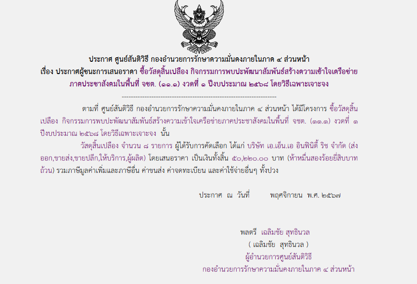 จัดซื้อ จัดจ้างประกาศผู้ชนะการเสนอราคา ประกาศผู้ชนะการเสนอราคา ซื้อวัสดุสิ้นเปลือง กิจกรรมการพบปะพัฒนาสัมพันธ์สร้างความเข้าใจเครือข่าย ภาคประชาสังคมในฟื้นที่ จชต. (๑๑.๑) งวดที่ ๑ ปึงบประมาณ ๒๕๖๘ โดยวิธีเฉพาะเจาะจง January 3, 2025 219 Share Facebook Twitter Google+ Telegram LINE