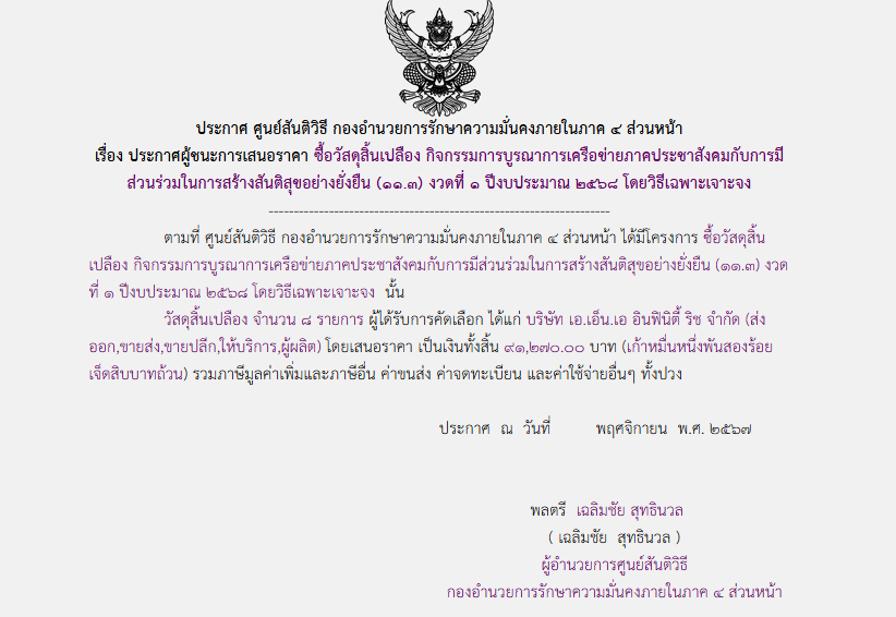 จัดซื้อ จัดจ้างประกาศผู้ชนะการเสนอราคา ประกาศผู้ชนะการเสนอราคา ซื้อวัสดุสิ้นเปลือง กิจกรรมการบูรณาการเครือข่ายภาคประชาสังคมกับการมี ส่วนร่วมในการสร้างสันติสุขอย่างยั่งยืน (๑๐.๓) งวดที่ ๑ ปีงบประมาณ ๒๕๖๘ โดยวิธีเฉพาะเจาะจง January 3, 2025 281 Share Facebook Twitter Google+ Telegram LINE