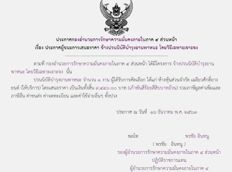ประกาศผู้ชนะการเสนอราคา จ้างปรนนิบัติบำรุงยานพาหนะ โดยวิธีเฉพาะเจาะจง (9,440.00)