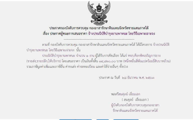 ประกาศผู้ชนะการเสนอราคา จ้างปรนนิบัติบำรุงยานพาหนะ โดยวิธีเฉพาะเจาะจง (14,820.00)