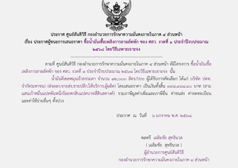 จัดซื้อ จัดจ้างประกาศผู้ชนะการเสนอราคา ประกาศผู้ชนะการเสนอราคา ซื้อน้ำมันเชื้อเพลิงการลาผลัดพัก ของ ศสว. งวดที่ & ประจำปีงบประมาณ ๒๕๖๘ โดยวิธีเฉพาะเจาะจง January 9, 2025 298 Share Facebook Twitter Google+ Telegram LINE