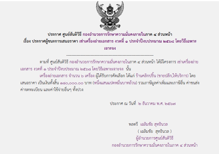 ประกาศผู้ชนะการเสนอราคา เข่าเครื่องถ่ายเอกสาร งวดที่ ๑ ประจำปีงบประมาณ ๒๕๖๘ โดยวิธีเฉพาะ เจาะจง