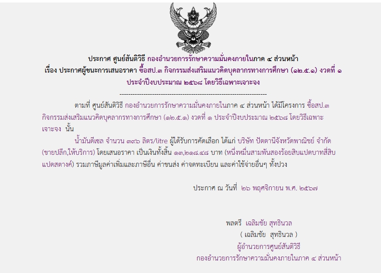 จัดซื้อ จัดจ้างประกาศผู้ชนะการเสนอราคา ประกาศผู้ชนะการเสนอราคา ซื้อสป.๓ กิจกรรมส่งเสริมแนวคิดบุคลากรทางการศึกษา (๑๒.๕.๘) งวดที่ ๑ ประจำปิ๊งบประมาณ ๒๕๖๘ โดยวิธีเฉพาะเจาะจง January 11, 2025 260 Share Facebook Twitter Google+ Telegram LINE