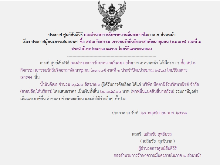 จัดซื้อ จัดจ้างประกาศผู้ชนะการเสนอราคา ประกาศผู้ชนะการเสนอราคา ซื้อ สป.๓ กิจกรรม เยาวชนรักถิ่นจิตอาสาพัฒนาชุมชน (๑๐.๓.๓.๙) งวดที่ ๑ ประจำปิ๊งบประมาณ ๒๕๖๘ โดยวิธีเฉพาะเจาะจง January 11, 2025 221 Share Facebook Twitter Google+ Telegram LINE