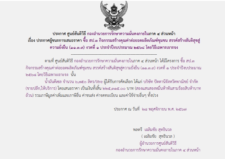 จัดซื้อ จัดจ้างประกาศผู้ชนะการเสนอราคา ประกาศผู้ชนะการเสนอราคา ซื้อ สป.๓ กิจกรรมสร้างคุณค่าต่อยอดผลิตภัณฑ์ชุมชน สรรค์สร้างสันติสุขสู ความยั่งยืน (๑๑.๓.๙) งวดที่ ๑ ประจำปีงบประมาณ ๒๕๖๘ โดยวิธีเฉพาะเจาะจง January 11, 2025 262 Share Facebook Twitter Google+ Telegram LINE