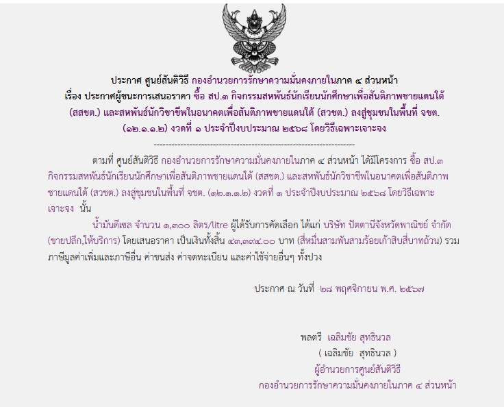 จัดซื้อ จัดจ้างประกาศผู้ชนะการเสนอราคา ประกาศผู้ชนะการเสนอราคา ซื้อ สป.๓ กิจกรรมสหพันธ์นักเรียนนักศึกษาเพื่อสันติภาพชายแดนใล้ (สสชต.) และสหพันธ์นักวิชาชีพในอนาคตเพื่อสันติภาพชายแดนใต้ (สวชต.) ลงสู่ชุมชนในพื้นที่ จขต. (๑๒.๑.๑.๒) งวดที่ ๑ ประจำปีงบประมาณ ๒๕๕๖๘ โดยวิธีเฉพาะเจาะจง January 11, 2025 296 Share Facebook Twitter Google+ Telegram LINE
