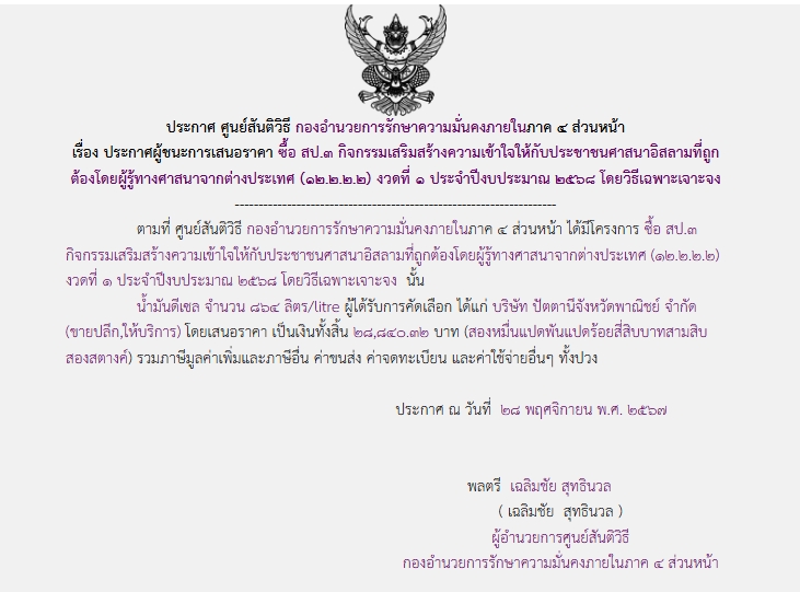 จัดซื้อ จัดจ้างประกาศผู้ชนะการเสนอราคา ประกาศผู้ชนะการเสนอราคา ซื้อ สป.๓ กิจกรรมเสริมสร้างความเข้าใจให้กับประชาชนศาสนาอิสลามที่ถูก ต้องโดยผู้รู้ทางศาสนาจากต่างประเทศ (๑๒๒.๒.๒) งวดที่ ๑ ประจำปีงบประมาณ ๒๕๖๘ โดยวิธีเฉพาะเจาะจง January 11, 2025 214 Share Facebook Twitter Google+ Telegram LINE