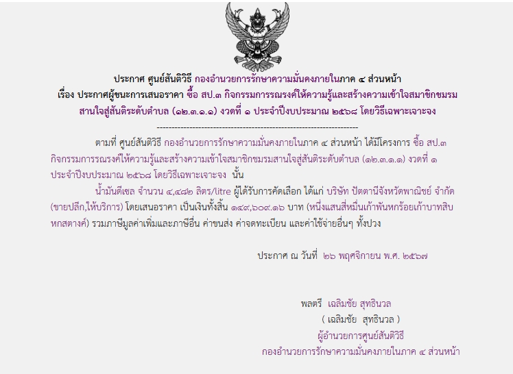 จัดซื้อ จัดจ้างประกาศผู้ชนะการเสนอราคา ประกาศผู้ชนะการเสนอราคา ซื้อ สป.๓ กิจกรรมการรณรงค์ให้ความรู้และสร้างความเข้าใจสมาชิกชมรม สานใจสู่สันติระดับตำบล (๑๒.๓.๑.๑) งวดที่ ๑ ประจำปิ๊งบประมาณ ๒๕๖๘ โดยวิธีเฉพาะเจาะจง January 11, 2025 206 Share Facebook Twitter Google+ Telegram LINE