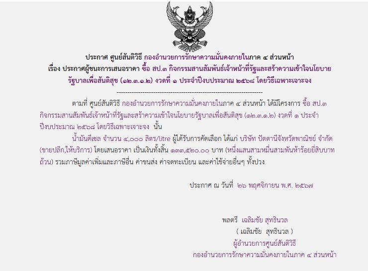 จัดซื้อ จัดจ้างประกาศผู้ชนะการเสนอราคา ประกาศผู้ขนะการเสนอราคา ซื้อ สป.๓ กิจกรรมสานสัมพันธ์เจ้าหน้าที่รัฐและสร้าความเข้าใจนโยบาย รัฐบากเพื่อต้นติสุข (๑๒.๓.๑.๒) งวดที่ ๑ ประจำโทบประนาณ ๒๕๖๖๘ โดยวิธีเฉพาะเจาะจง January 11, 2025 269 Share Facebook Twitter Google+ Telegram LINE