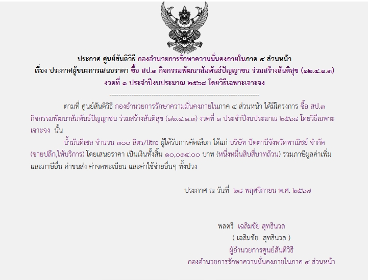 จัดซื้อ จัดจ้างประกาศผู้ชนะการเสนอราคา ประกาศผู้ชนะการเสนอราคา ซื้อ สป.๓ กิจกรรมพัฒนาสัมพันธ์ปัญญาชน ร่วมสร้างสันติสุข (๑๒.๔.๔.๓) งวดที่ ๑ ประจำปิ๊งบประมาณ ๒๕๖๘ โดยวิธีเฉพาะเจาะจง January 11, 2025 265 Share Facebook Twitter Google+ Telegram LINE