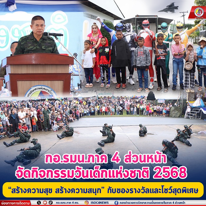 วันนี้ (11 มกราคม 2568) เวลา 08.30 น. ณ แหล่งรวมรถ กรมทหารราบที่ 152 ค่ายสิรินธร ตำบลเขาตูม อำเภอยะรัง จังหวัดปัตตานี พลโท ไพศาล หนูสังข์ แม่ทัพภาคที่ 4 / ผู้อำนวยการรักษาความมั่นคงภายในภาค 4 เป็นประธานเปิดกิจกรรมวันเด็กแห่งชาติ ประจำปี 2568 เพื่อให้เยาวชนได้เปิดประสบการณ์การเรียนรู้ พร้อม สร้างความสุข สร้างความสนุก แก่น้อง ๆ เยาวชน โดยในปีนี้ได้รับโอกาสดีจากทุกภาคส่วนโดยเฉพาะผู้ใหญ่ใจดีจากบริษัทกลุ่มเซ็นทรัล จำกัด สนับสนุนของขวัญจำนวนมาก ตลอดจนหน่วยงานภาครัฐ ภาคเอกชน ร่วมจัดนิทรรศการและกิจกรรมต่าง ๆ เติมเต็มความฝันและสร้างพลังบวกให้กับเยาวชนและครอบครัวในพื้นที่จังหวัดชายแดนภาคใต้ โดยมี พลตรี วรเดช เดชรักษา รองแม่ทัพภาคที่ 4 / รองผู้อำนวยการรักษาความมั่นคงภายในภาค 4 ส่วนหน้า, พลตรี ชาคริต อุจะรัตน รองผู้อำนวยการรักษาความมั่นคงภายในภาค 4 ส่วนหน้า, คณะผู้บังคับบัญชา จากกองอำนวยการรักษาความมั่นคงภายในภาค 4 ส่วนหน้า, นายไชยพร นิยมแก้ว รองผู้ว่าราชการจังหวัดปัตตานี, นายกสมาคมสันนิบาตเสรีไทย-มาเลเซีย, ผู้แทนศูนย์การค้าเซ็นทรัลหาดใหญ่, หัวหน้าส่วนราชการ หน่วยเฉพาะกิจในพื้นที่ ตลอดจนเยาวชน ผู้ปกครอง และคณะครู ร่วมกิจกรรมเป็นจำนวนมาก