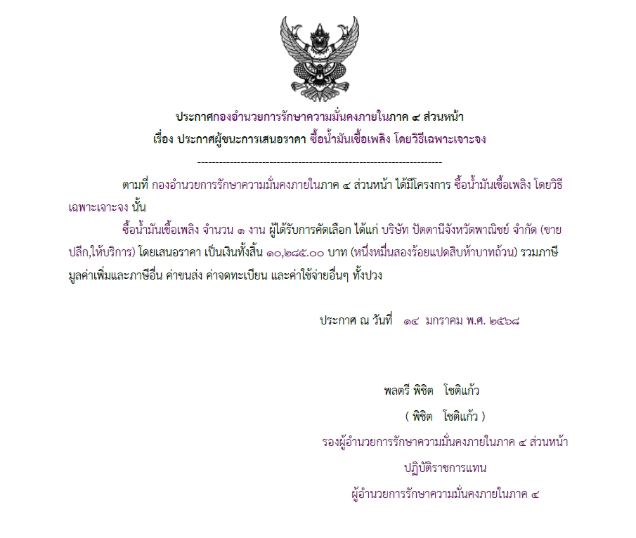 ประกาศผู้ชนะการเสนอราคา ซื้อน้ำมันเชื้อเพลิง โดยวิธีเฉพาะเจาะจะจง