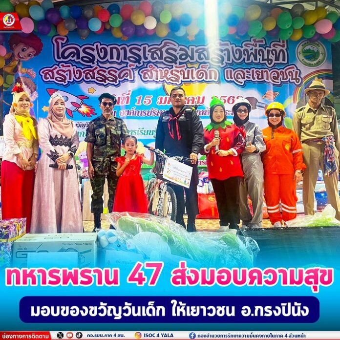 หน่วยเฉพาะกิจกรมทหารพรานที่ 47 นำกำลังพลเข้าร่วมกิจกรรมวันเด็กแห่งชาติ ณ องค์การบริหารส่วนตำบลห้วยกระทิง หมู่ที่ 3 ตำบลห้วยกระทิง อำเภอกรงปินัง จังหวัดยะลา โดยมีการมอบของขวัญและรางวัลสนับสนุนกิจกรรมวันเด็ก เพื่อส่งเสริมพัฒนาการทั้งด้านร่างกายและจิตใจของเยาวชน กิจกรรมครั้งนี้มุ่งเน้นสร้างความตระหนักถึงสิทธิ หน้าที่ ความรับผิดชอบ และการมีระเบียบวินัยของเด็กและเยาวชน รวมทั้งปลูกฝังความรักและความยึดมั่นในสถาบันชาติ ศาสนา พระมหากษัตริย์ โดยมีเด็ก ๆ และผู้ปกครองในพื้นที่เข้าร่วมงานอย่างคึกคัก
