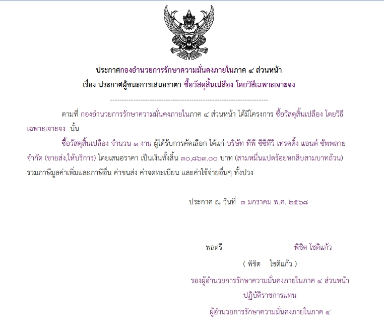 ประกาศผู้ขนะการเสนอราคา ชื่อวัสดุสิ้นเปลือง โดยวิธีเฉพาะเจาะจง