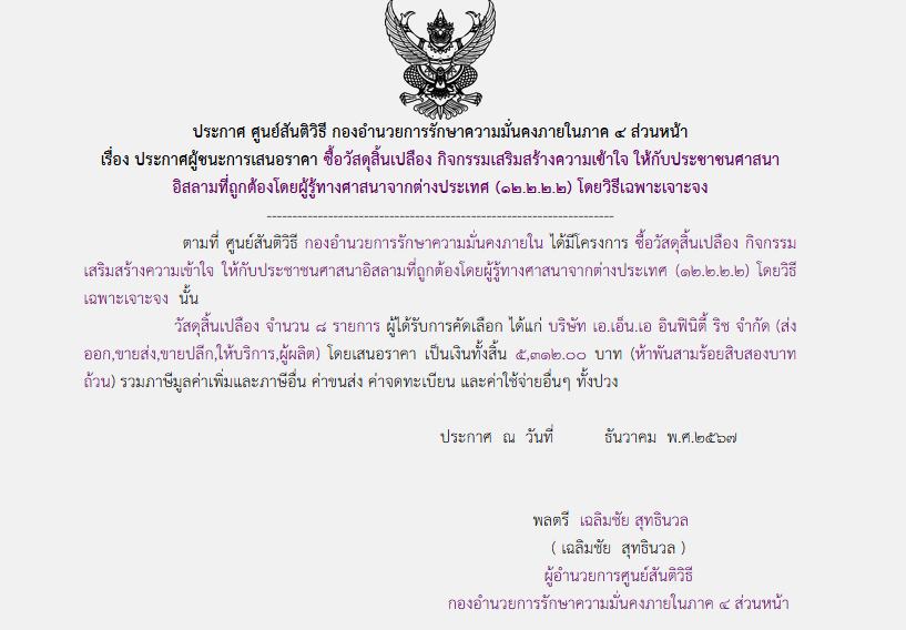 จัดซื้อ จัดจ้างประกาศผู้ชนะการเสนอราคา ประกาศผู้ขนะการเสนอราคา ซื้อวัสดุสิ้นเปลือง กิจกรรมเสริมสร้างความเข้าใจ ให้กับประชาชนศาสนา อิสลามที่ถูกต้องโดยผู้รู้ทางศาสนาจากต่างประเทศ (๑๒.๒.๒.๒) โดยวิธีเฉพาะเจาะจง January 20, 2025 224 Share Facebook Twitter Google+ Telegram LINE