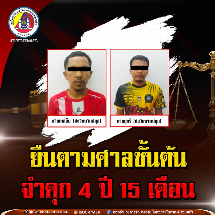 และเมื่อวันที่ 19 ธันวาคม 2566 ศาลจังหวัดนราธิวาส พิพากษา “จำคุก 4 ปี 15 เดือน” นายคอเล็บ (สงวนนามสกุล) จำเลยที่ 1, นายสุกรี (สงวนนามสกุล) จำเลยที่ 3 และ นายฮาซัน (สงวนนามสกุล) จำเลยที่ 4 เนื่องจากพยานหลักฐานที่ยึดมาได้ ประกอบกับพยานบุคคลที่เบิกความสอดคล้องตรงกับคำให้การของจำเลยทั้ง 3 ราย สามารถรับฟังและมีน้ำหนักมั่นคงเพียงพอให้ลงโทษจำเลยได้ โดยขังนายคอเล็บ จำเลยที่ 1 และนายสุกรี จำเลยที่ 3 และ นายฮาซัน (สงวนนามสกุล) จำเลยที่ 4 สำหรับ นายมูฮำมัดแพนดี (สงวนนามสกุล) จำเลยที่ 2 ได้หลบหนีก่อนการดำเนินการพิจารณาในชั้นศาล ศาลจึงออกหมายจับ, จำหน่ายคดีและฟ้องเป็นคดีใหม่เนื่องจาก หลบหนี