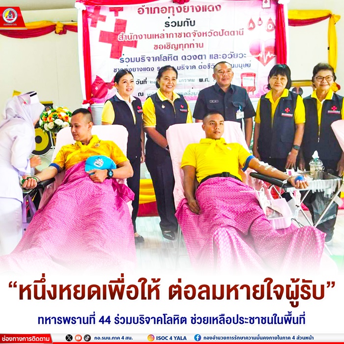 หน่วยเฉพาะกิจกรมทหารพรานที่ 44 นำกำลังพลจิตอาสาพระราชทานเข้าร่วมกิจกรรมบริจาคโลหิต ประจำปี 2568 ในโครงการ “ชาวทุ่งยางแดง ร่วมใจบริจาคต่อชีวิตเพื่อนมนุษย์” เพื่อสนับสนุนเหล่ากาชาดจังหวัดปัตตานี